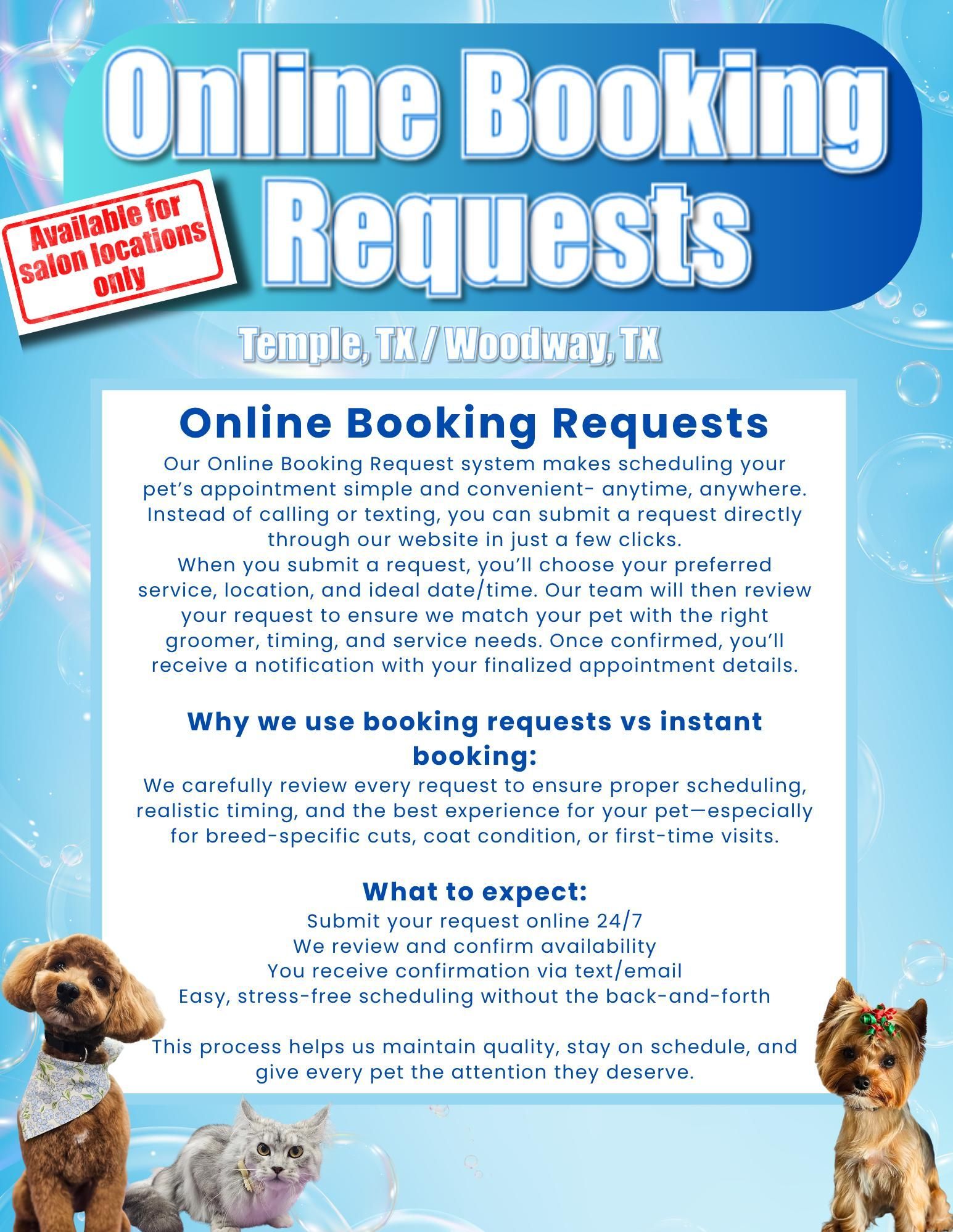 Scheduling your pet’s appointment has never been easier. Our Online Booking Request system allows you to submit your preferred service, location, and timing in just a few clicks- no calls or back-and-forth needed.
